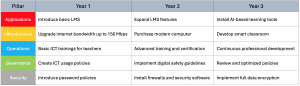 Once a school has defined its current and future ICT system, the next step is to create a transition plan. This plan is organized using a Transition Matrix, which outlines the goals for each pillar over a specific timeframe.